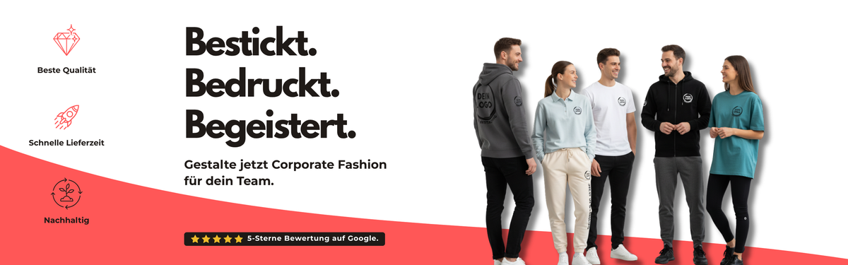 Wir sind dein Partner rund um's Thema Corporarte Wear und professionelle Textilveredelung. Wir sorgen für die individuelle Umsetzung deines Projekts. Als Profi-Textilausstatter in zweiter Generation beraten wir dich gerne welches das beste Textil mit Veredelung am besten für dein Projekt und Budget passt.